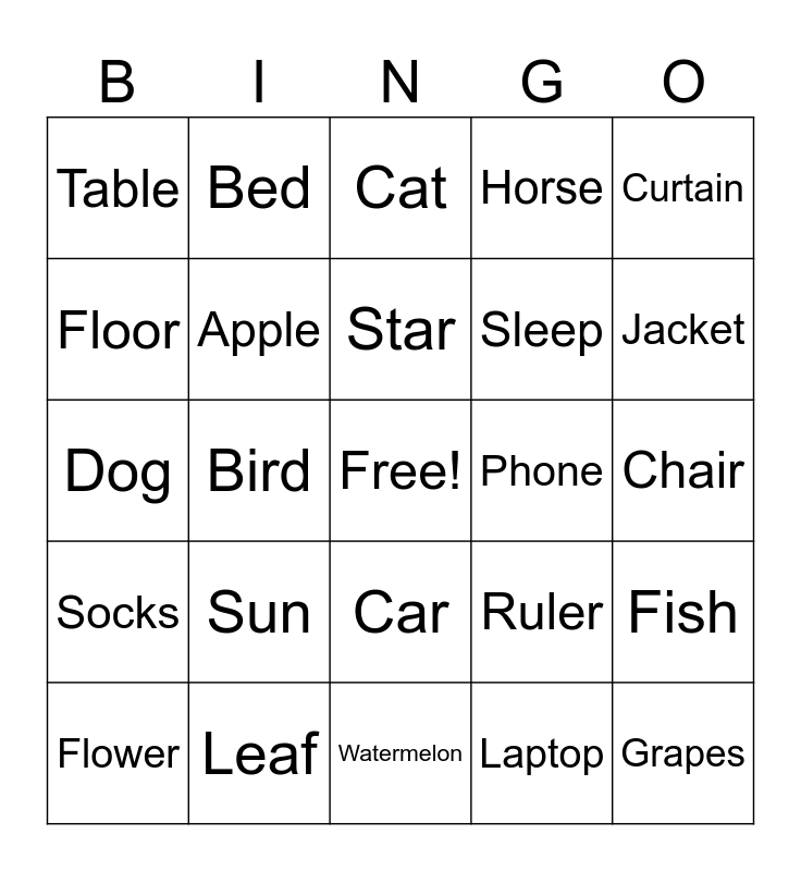 This bingo card has a free space and 24 words: Sun, Leaf, Star, Flower, Curtain, Table, Floor, Bed, Phone, Car, Sleep, Dog, Ruler, Fish, Apple, Laptop, Chair, Cat, Jacket, Bird, Grapes, Socks, Horse and Watermelon.