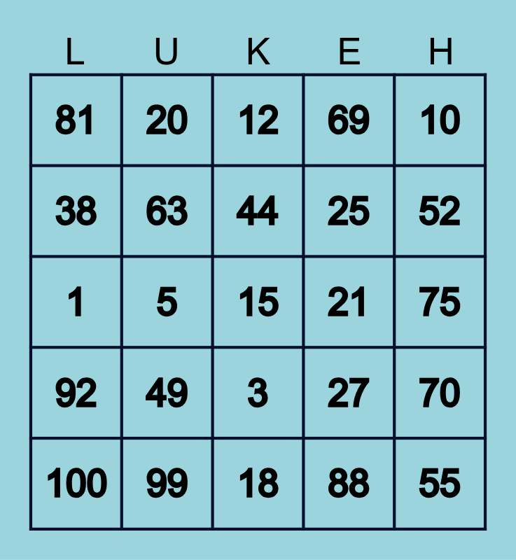 This bingo card has a free space and 24 words: 49, 99, 44, 100, 10, 81, 38, 20, 21, 3, 25, 1, 27, 70, 63, 88, 75, 12, 52, 5, 55, 92, 69 and 18.