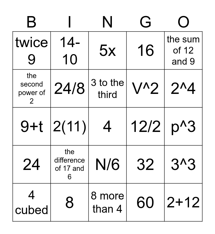 This bingo card has 25 words: the difference of 17 and 6, 8 more than 4, 3 to the third, 4 cubed, the sum of 12 and 9, twice 9, the second power of 2, 14-10, 12/2, N/6, V^2, 9+t, 32, 3^3, 24/8, 2+12, p^3, 5x, 2^4, 2(11), 4, 8, 24, 16 and 60.