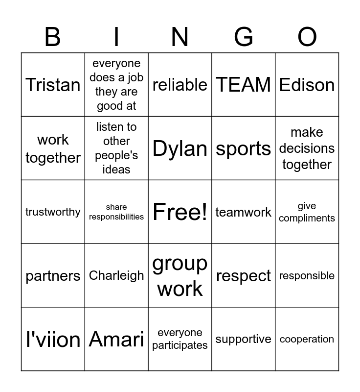 This bingo card has a free space and 24 words: Charleigh, Amari, Dylan, I'viion, Edison, Tristan, work together, everyone does a job they are good at, teamwork, group work, sports, trustworthy, respect, responsible, listen to other people's ideas, supportive, give compliments, reliable, make decisions together, share responsibilities, cooperation, partners, TEAM and everyone participates.