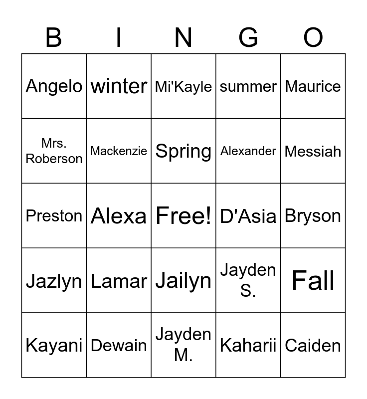 This bingo card has a free space and 29 words: Kayani, Kennedi, Alexa, Zeta, Angelo, Mi'Kayle, Mackenzie, Lamar, D'Asia, Dewain, Bryson, Caiden, Jayden M., Kaharii, Messiah, Yandiel, Jailyn, Jazlyn, Maurice, Preston, Jayden S., Daemon, Alexander, Mrs. Roberson, summer, winter, Fall, Spring and Easter.