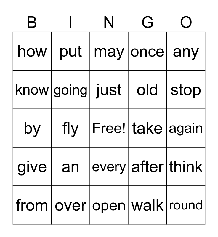 This bingo card has a free space and 24 words: an, over, just, from, any, how, know, put, take, every, old, by, after, think, going, walk, again, may, stop, fly, round, give, once and open.