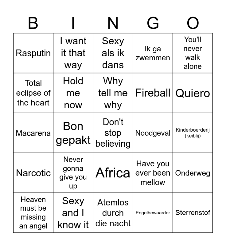This bingo card has 25 words: Never gonna give you up, Atemlos durch die nacht, Why tell me why, Heaven must be missing an angel, You'll never walk alone, Rasputin, Total eclipse of the heart, I want it that way, Noodgeval, Africa, Fireball, Macarena, Have you ever been mellow, Onderweg, Hold me now, Sterrenstof, Kinderboerderij (keiblij), Sexy als ik dans, Quiero, Bon gepakt, Don't stop believing, Sexy and I know it, Narcotic, Ik ga zwemmen and Engelbewaarder.