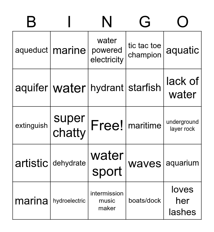 This bingo card has a free space and 24 words: dehydrate, hydroelectric, hydrant, marina, aquatic, aqueduct, aquifer, marine, maritime, water sport, starfish, extinguish, waves, aquarium, water, boats/dock, underground layer rock, water powered electricity, lack of water, super chatty, loves her lashes, artistic, tic tac toe champion and intermission music maker.