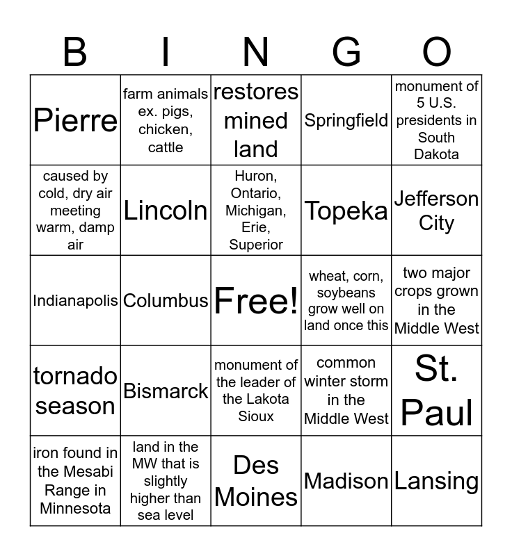 This bingo card has a free space and 24 words: Bismarck, land in the MW that is slightly higher than sea level, Huron, Ontario, Michigan, Erie, Superior, iron found in the Mesabi Range in Minnesota, monument of 5 U.S. presidents in South Dakota, Pierre, caused by cold, dry air meeting warm, damp air, farm animals ex. pigs, chicken, cattle, wheat, corn, soybeans grow well on land once this, monument of the leader of the Lakota Sioux, Topeka, Indianapolis, common winter storm in the Middle West, St. Paul, Lincoln, Madison, two major crops grown in the Middle West, restores mined land, Jefferson City, Columbus, Lansing, tornado season, Springfield and Des Moines.