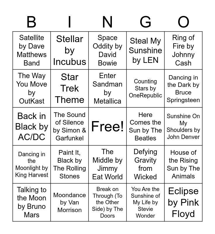 This bingo card has a free space and 45 words: Total Eclipse of the Heart by Bonnie Tyler, Eclipse by Pink Floyd, Ain’t No Sunshine by Bill Withers, Talking to the Moon by Bruno Mars, Fly Me to the Moon by Frank Sinatra and Count Basie, You Are the Sunshine of My Life by Stevie Wonder, Space Oddity by David Bowie, Halo by Beyonce, Ring of Fire by Johnny Cash, Moondance by Van Morrison, Steal My Sunshine by LEN, Here Comes the Sun by The Beatles, The Middle by Jimmy Eat World, Paint It, Black by The Rolling Stones, Sunshine of Your Love by Cream, Break on Through (To the Other Side) by The Doors, Mr. Blue Sky by Electric Light Orchestra, Back in Black by AC/DC, Houdini by Dua Lipa, Dancing in the Dark by Bruce Springsteen, Stellar by Incubus, I Believe in a Thing Called Love by The Darkness, Mr. Brightside by The Killers, Satellite by Dave Matthews Band, Bad Moon Rising by Creedence Clearwater Revival, Sunshine On My Shoulders by John Denver, Bury a Friend by Billie Eilish, Starlight by Muse, Defying Gravity from Wicked, Dancing in the Moonlight by King Harvest, Don’t Let the Sun Go Down On Me by Elton John, House of the Rising Sun by The Animals, The Final Countdown by Europe, Sunshine Superman by Donovan, Intergalactic by the Beastie Boys, The Sound of Silence by Simon & Garfunkel, Starships by Nicki Minaj, Bark at the Moon by Ozzy Osbourne, Man on the Moon by R.E.M., Enter Sandman by Metallica, The Way You Move by OutKast, Counting Stars by OneRepublic, Doctor Who Theme, Star Trek Theme and Star Wars Theme.