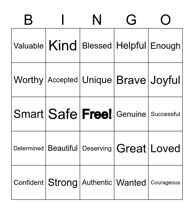 This bingo card has a free space and 24 words: Beautiful, Strong, Unique, Confident, Enough, Valuable, Worthy, Kind, Genuine, Deserving, Brave, Smart, Great, Loved, Accepted, Wanted, Successful, Blessed, Joyful, Safe, Courageous, Determined, Helpful and Authentic.