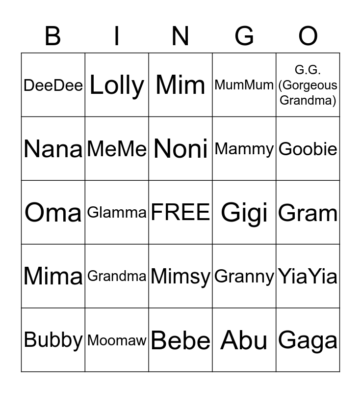 This bingo card has a free space and 24 words: Grandma, Moomaw, Noni, Bubby, G.G. (Gorgeous Grandma), DeeDee, Nana, Lolly, Gigi, Mimsy, Mammy, Oma, Granny, YiaYia, MeMe, Abu, Gram, Mim, Goobie, Glamma, Gaga, Mima, MumMum and Bebe.