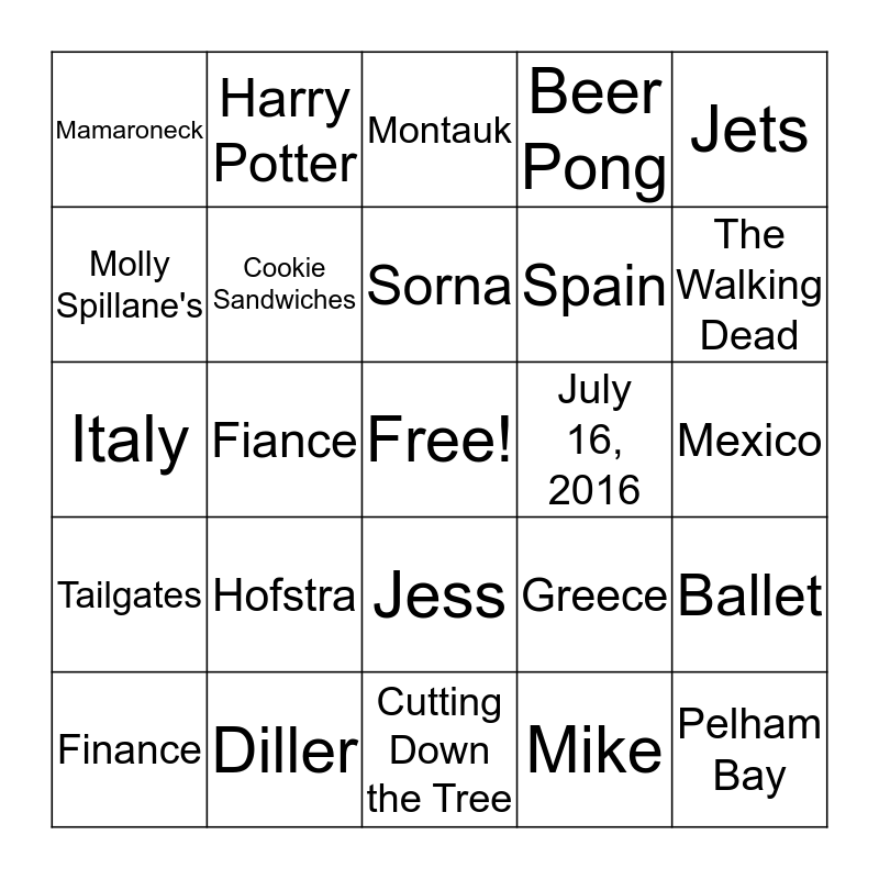 This bingo card has a free space and 26 words: Jess, Mike, Sorna, Diller, Jets, Mamaroneck, Molly Spillane's, Harry Potter, Mexico, Greece, Spain, Italy, Ballet, Finance, Fiance, Teacher, Beer Pong, Tailgates, Montauk, Pelham Bay, The Walking Dead, Cutting Down the Tree, July 16, 2016, Hofstra, Cookie Sandwiches and Dutch Treats.