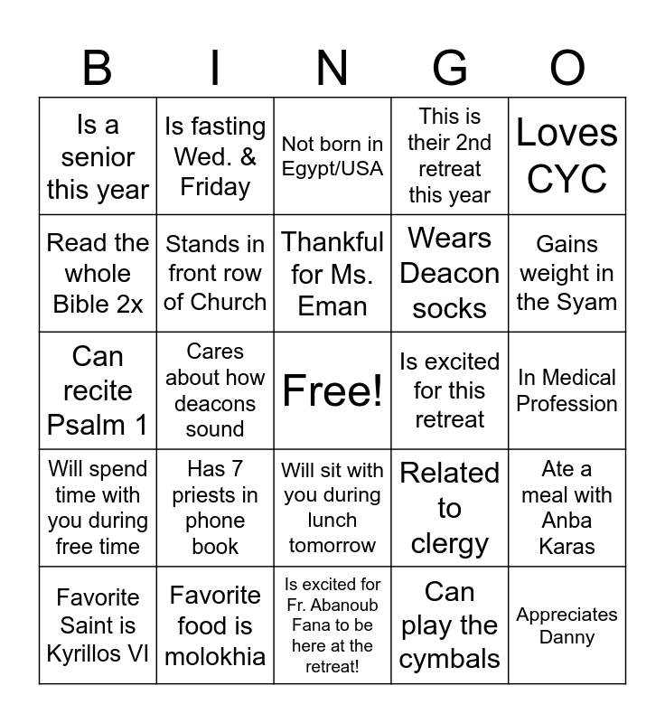 This bingo card has a free space and 24 words: Has 7 priests in phone book, Favorite food is molokhia, Thankful for Ms. Eman, Favorite Saint is Kyrillos VI, Loves CYC, Is a senior this year, Read the whole Bible 2x, Is fasting Wed. & Friday, Is excited for this retreat, Will sit with you during lunch tomorrow, Wears Deacon socks, Can recite Psalm 1, Related to clergy, Ate a meal with Anba Karas, Stands in front row of Church, Can play the cymbals, In Medical Profession, Not born in Egypt/USA, Gains weight in the Syam, Cares about how deacons sound, Appreciates Danny, Will spend time with you during free time, This is their 2nd retreat this year and Is excited for Fr. Abanoub Fana to be here at the retreat!.