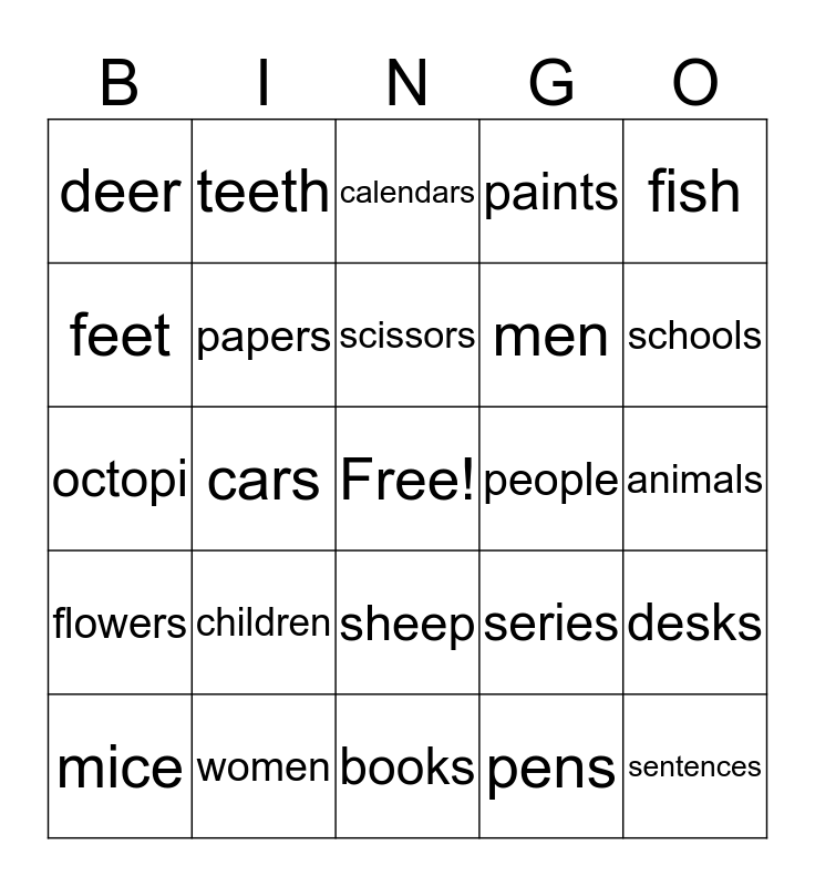 This bingo card has a free space and 24 words: children, women, scissors, mice, fish, deer, feet, teeth, people, sheep, men, octopi, series, desks, papers, pens, animals, calendars, schools, cars, sentences, flowers, paints and books.