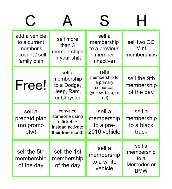 This bingo card has 16 words: sell the 1st membership of the day, sell a membership to a black truck, sell a membership to a previous member (inactive), add a vehicle to a current member's account / sell family plan, sell a prepaid plan (no promo btw), sell more than 3 memberships in your shift, sell a membership to a pre-2010 vehicle, sell a membership to a white vehicle, Free!, sell a membership to a Dodge, Jeep, Ram, or Chrysler, sell the 5th membership of the day, sell two OG Mint memberships, convince someone using a ticket to instead activate their free month, sell the 9th membership of the day, sell a membership to a primary colour car (yellow, blue, or red) and sell a membership to a Mercedes or BMW.