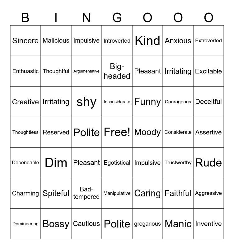 This bingo card has a free space and 48 words: Caring, Irritating, Polite, Reserved, shy, Assertive, Malicious, Bossy, Anxious, Egotistical, Extroverted, Introverted, Courageous, Funny, Charming, Considerate, Enthuastic, Excitable, Faithful, Kind, Pleasant, Polite, Sincere, Thoughtful, Aggressive, Argumentative, Deceitful, Domineering, Inconsiderate, Irritating, Manic, Moody, Rude, Spiteful, Thoughtless, Impulsive, Trustworthy, Creative, Pleasant, Bad-tempered, Dependable, Inventive, Impulsive, Cautious, Big-headed, Manipulative, Dim and gregarious.