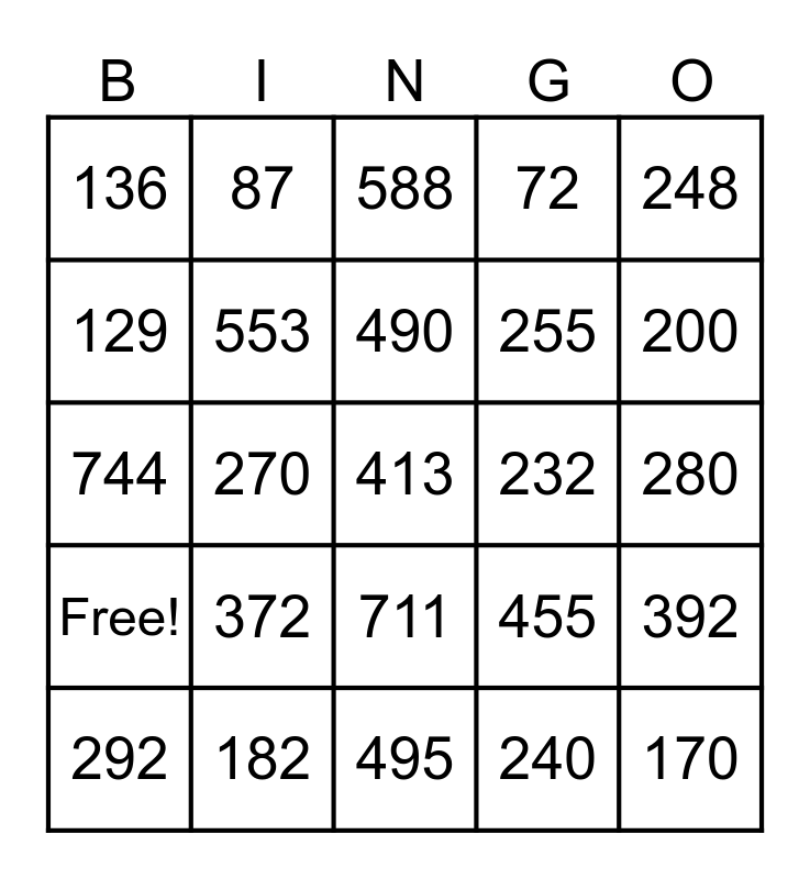 This bingo card has a free space and 29 words: 292, 216, 270, 322, 136, 588, 553, 372, 232, 182, 280, 170, 495, 240, 200, 456, 711, Free!, 248, 744, 455, 528, 255, 129, 72, 87, 392, 490 and 252.