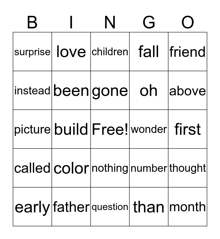 This bingo card has a free space and 24 words: color, father, gone, early, friend, surprise, instead, love, wonder, nothing, oh, picture, number, thought, been, than, first, children, above, build, month, called, fall and question.