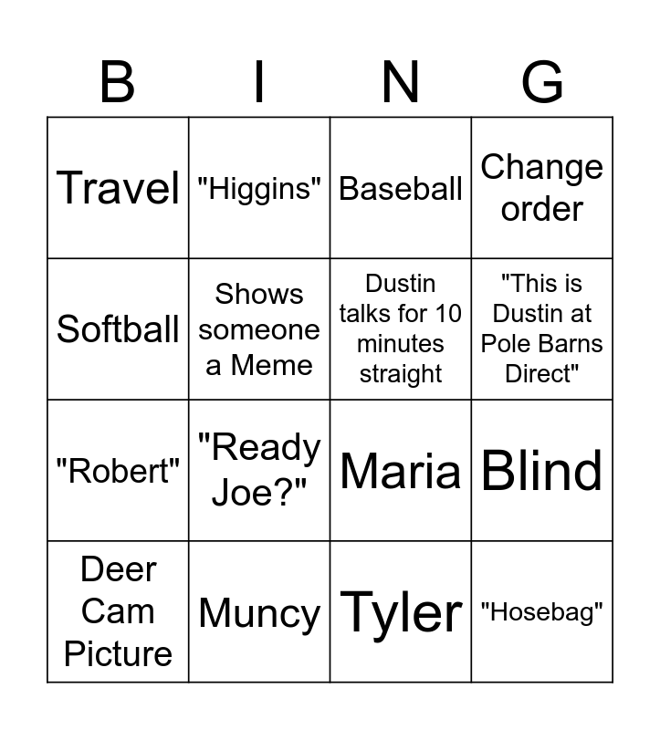 This bingo card has 16 words: Muncy, Blind, Baseball, Travel, "Robert", "Higgins", Maria, Tyler, Softball, Shows someone a Meme, Deer Cam Picture, Change order, "Ready Joe?", "This is Dustin at Pole Barns Direct", Dustin talks for 10 minutes straight and "Hosebag".