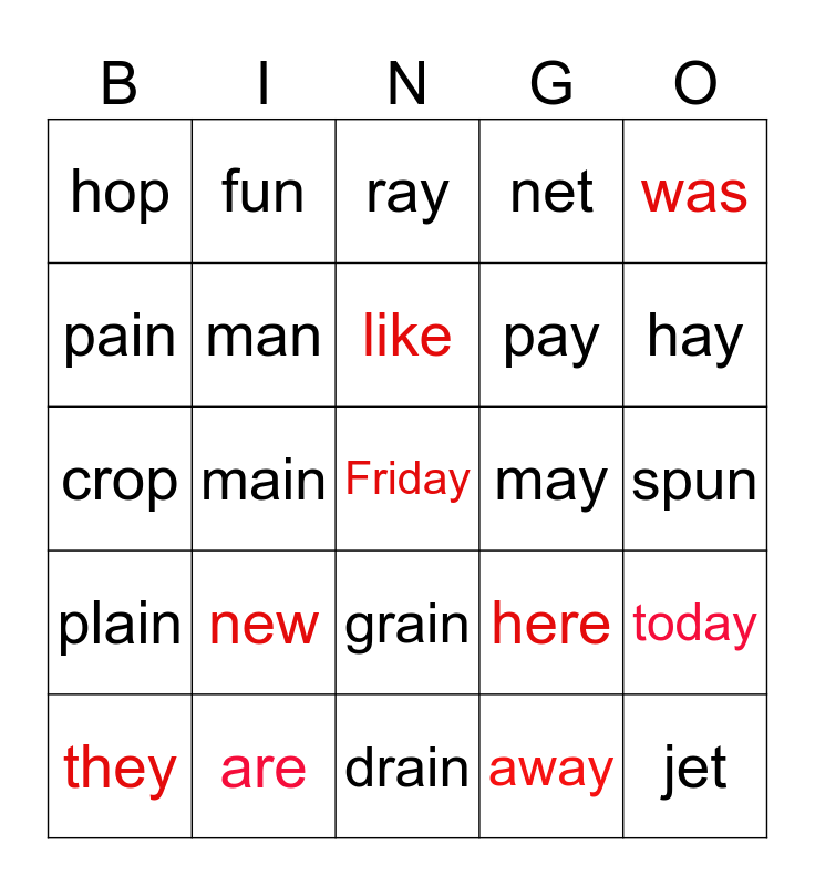 This bingo card has a free space and 24 words: new, are, like, they, was, hop, pain, fun, may, grain, pay, crop, here, today, man, away, spun, ray, hay, main, jet, plain, net and drain.