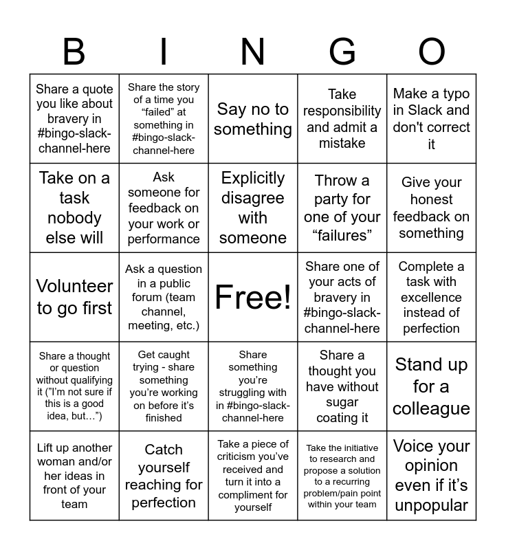 This bingo card has a free space and 33 words: Share a thought in a meeting when you normally wouldn't, Share a suggestion even if you’re not 100% sure it’s the “best” suggestion, Ask a question in a public forum (team channel, meeting, etc.), Lead a thing (tech talk, lightning talk, group discussion, etc.), Share a thought or question without qualifying it (”I’m not sure if this is a good idea, but…”), Ask someone for feedback on your work or performance, Make a typo in Slack and don't correct it, Lift up another woman and/or her ideas in front of your team, Share the story of a time you “failed” at something in #bingo-slack-channel-here, Do something you’re not “good" at, Explicitly disagree with someone, Say no to something, Brag about yourself or one of your accomplishments in #bingo-slack-channel-here, Brag about another woman in #bingo-slack-channel-here, Share one of your acts of bravery in #bingo-slack-channel-here, Give your honest feedback on something, Catch yourself reaching for perfection, Volunteer to go first, Get caught trying - share something you’re working on before it’s finished, Share a thought you have without sugar coating it, Share something you’re struggling with in #bingo-slack-channel-here, Take one of your “failures” and put a positive spin on it!, Share a quote you like about bravery in #bingo-slack-channel-here, Complete a task with excellence instead of perfection, Take a piece of criticism you’ve received and turn it into a compliment for yourself, Voice your opinion even if it’s unpopular, Take responsibility and admit a mistake, Throw a party for one of your “failures”, Take on a task nobody else will, Stand up for a colleague, Participate in a training session or professional development opportunity, Take the initiative to research and propose a solution to a recurring problem/pain point within your team and Share a helpful tip or resource in a public forum.