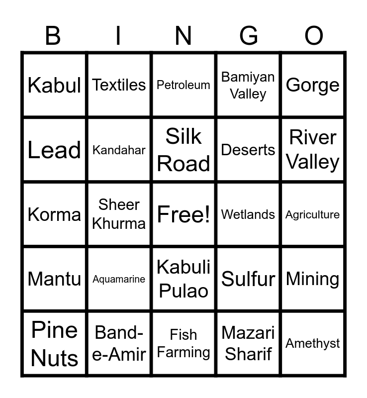 This bingo card has a free space and 24 words: Aquamarine, Band-e-Amir, Silk Road, Pine Nuts, Gorge, Kabul, Lead, Textiles, Wetlands, Kabuli Pulao, Deserts, Korma, Sulfur, Mining, Kandahar, Mazari Sharif, Agriculture, Petroleum, River Valley, Sheer Khurma, Amethyst, Mantu, Bamiyan Valley and Fish Farming.