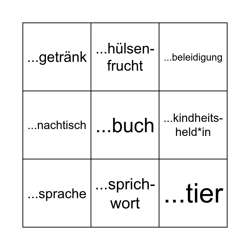 This bingo card has 12 words: ...farbe, ...tier, ...buch, ...kindheits-held*in, ...hülsen-frucht, ...beleidigung, ...sprich-wort, ...reiseziel, ...getränk, ...nachtisch, ...sprache and ...geruch.
