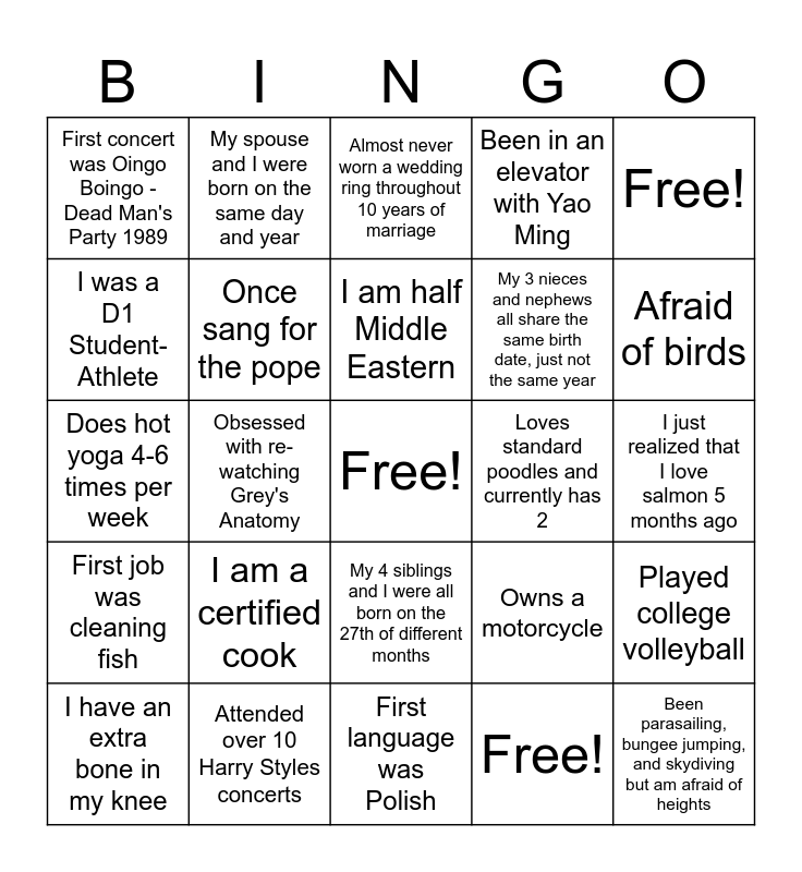 This bingo card has a free space and 24 words: I am a certified cook, Attended over 10 Harry Styles concerts, I am half Middle Eastern, I have an extra bone in my knee, Free!, First concert was Oingo Boingo - Dead Man's Party 1989, I was a D1 Student-Athlete, My spouse and I were born on the same day and year, Loves standard poodles and currently has 2, My 4 siblings and I were all born on the 27th of different months, My 3 nieces and nephews all share the same birth date, just not the same year, Does hot yoga 4-6 times per week, Owns a motorcycle, Played college volleyball, Once sang for the pope, Free!, I just realized that I love salmon 5 months ago, Almost never worn a wedding ring throughout 10 years of marriage, Afraid of birds, Obsessed with re-watching Grey's Anatomy, Been parasailing, bungee jumping, and skydiving but am afraid of heights, First job was cleaning fish, Been in an elevator with Yao Ming and First language was Polish.