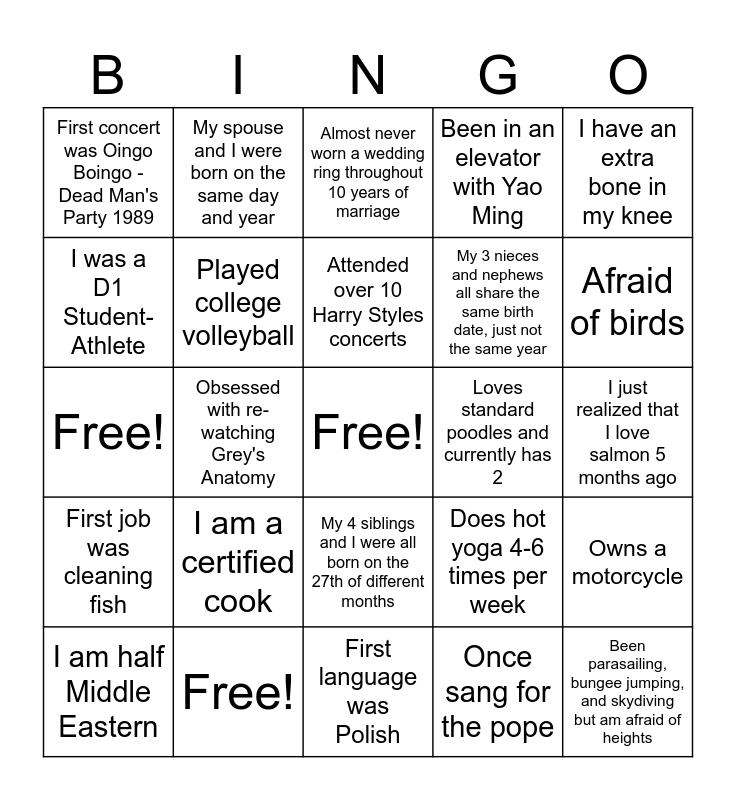 This bingo card has a free space and 24 words: I am a certified cook, Free!, Attended over 10 Harry Styles concerts, I am half Middle Eastern, I have an extra bone in my knee, First concert was Oingo Boingo - Dead Man's Party 1989, I was a D1 Student-Athlete, My spouse and I were born on the same day and year, Loves standard poodles and currently has 2, My 4 siblings and I were all born on the 27th of different months, My 3 nieces and nephews all share the same birth date, just not the same year, Free!, Does hot yoga 4-6 times per week, Owns a motorcycle, Played college volleyball, Once sang for the pope, I just realized that I love salmon 5 months ago, Almost never worn a wedding ring throughout 10 years of marriage, Afraid of birds, Obsessed with re-watching Grey's Anatomy, Been parasailing, bungee jumping, and skydiving but am afraid of heights, First job was cleaning fish, Been in an elevator with Yao Ming and First language was Polish.