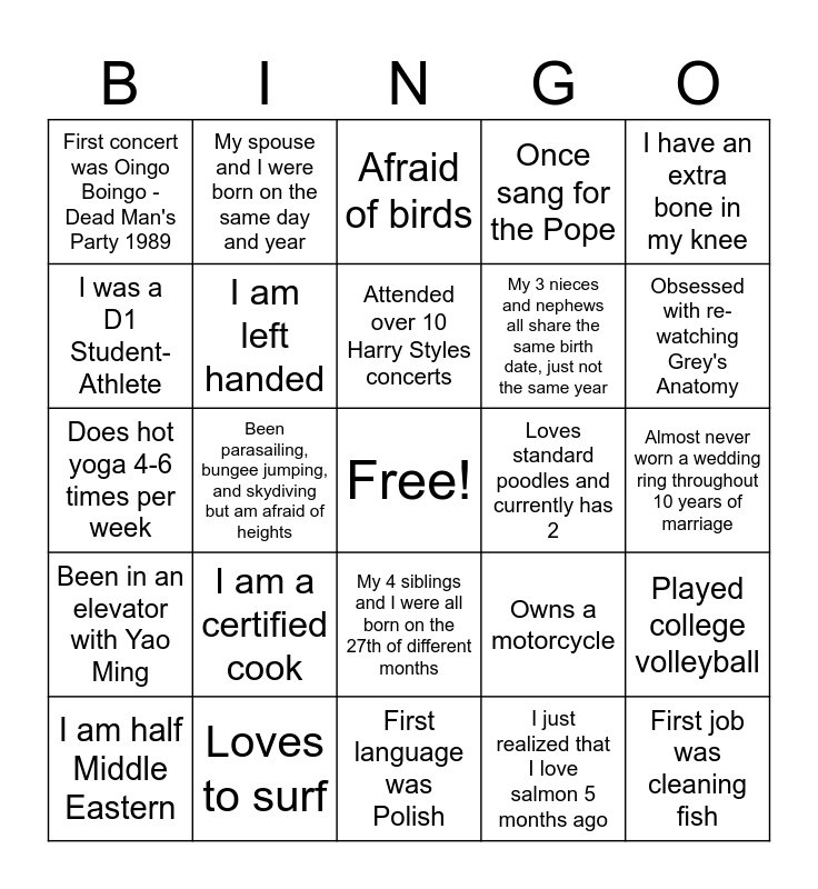 This bingo card has a free space and 24 words: I am a certified cook, Loves to surf, Attended over 10 Harry Styles concerts, I am half Middle Eastern, I have an extra bone in my knee, First concert was Oingo Boingo - Dead Man's Party 1989, I was a D1 Student-Athlete, My spouse and I were born on the same day and year, Loves standard poodles and currently has 2, My 4 siblings and I were all born on the 27th of different months, My 3 nieces and nephews all share the same birth date, just not the same year, Does hot yoga 4-6 times per week, Owns a motorcycle, Played college volleyball, I am left handed, I just realized that I love salmon 5 months ago, Almost never worn a wedding ring throughout 10 years of marriage, Afraid of birds, Obsessed with re-watching Grey's Anatomy, Been parasailing, bungee jumping, and skydiving but am afraid of heights, First job was cleaning fish, Been in an elevator with Yao Ming, Once sang for the Pope and First language was Polish.