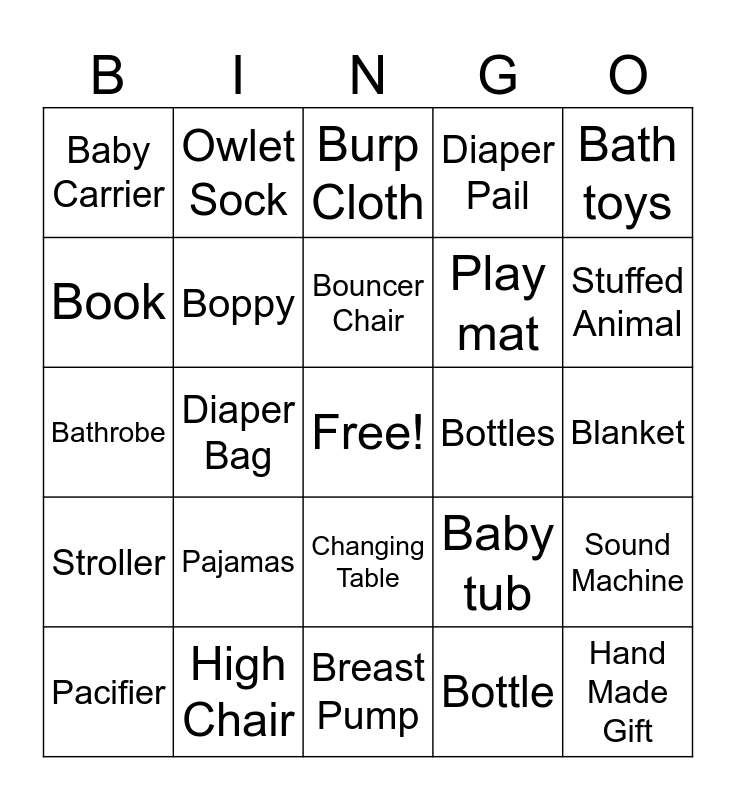 This bingo card has a free space and 29 words: Pacifier, Bibs, Diaper Bag, Car Seat, Baby Carrier, Burp Cloth, Boppy, Pajamas, Bottles, High Chair, Blanket, Hand Made Gift, Breast Pump, Bottle, Stuffed Animal, Diapers, Changing Table, Stroller, Bath toys, Bathrobe, Baby tub, Sleep swaddle, Play mat, Book, Diaper Pail, Owlet Sock, Sound Machine, Bouncer Chair and Mobile.