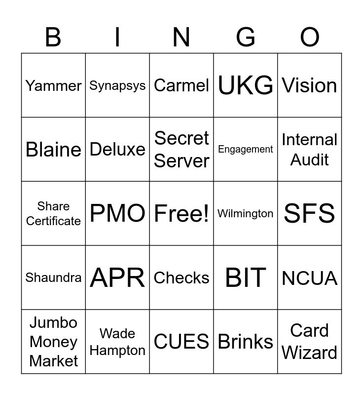 This bingo card has a free space and 24 words: APR, Wade Hampton, Secret Server, Jumbo Money Market, Vision, Yammer, Blaine, Synapsys, Wilmington, Checks, Engagement, Share Certificate, BIT, NCUA, Deluxe, Brinks, SFS, Carmel, Internal Audit, PMO, Card Wizard, Shaundra, UKG and CUES.