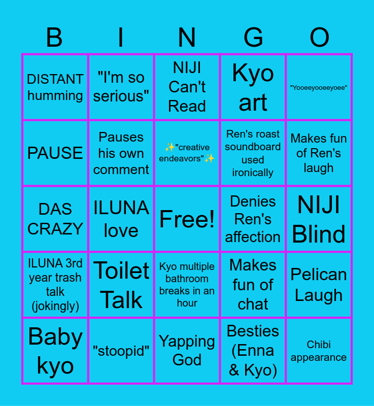 This bingo card has a free space and 24 words: Toilet Talk, "stoopid", ✨"creative endeavors"✨, Baby kyo, "Yooeeyooeeyoee", DISTANT humming, PAUSE, "I'm so serious", Denies Ren's affection, Kyo multiple bathroom breaks in an hour, Ren's roast soundboard used ironically, DAS CRAZY, Makes fun of chat, Pelican Laugh, Pauses his own comment, Besties (Enna & Kyo), NIJI Blind, NIJI Can't Read, Makes fun of Ren's laugh, ILUNA love, Chibi appearance, ILUNA 3rd year trash talk (jokingly), Kyo art and Yapping God.