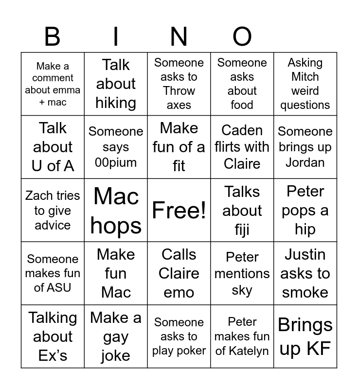 This bingo card has a free space and 24 words: Make fun Mac, Make a gay joke, Make fun of a fit, Talking about Ex’s, Asking Mitch weird questions, Make a comment about emma + mac, Talk about U of A, Talk about hiking, Talks about fiji, Calls Claire emo, Caden flirts with Claire, Zach tries to give advice, Peter mentions sky, Justin asks to smoke, Someone says 00pium, Peter makes fun of Katelyn, Peter pops a hip, Someone asks to Throw axes, Someone brings up Jordan, Mac hops, Brings up KF, Someone makes fun of ASU, Someone asks about food and Someone asks to play poker.
