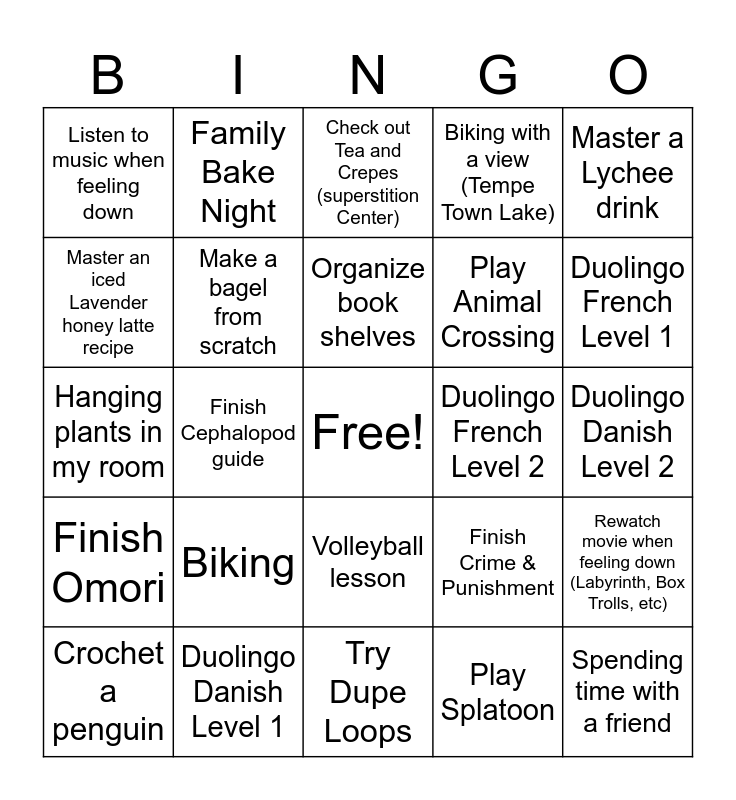 This bingo card has a free space and 24 words: Biking, Duolingo Danish Level 1, Organize book shelves, Crochet a penguin, Master a Lychee drink, Listen to music when feeling down, Master an iced Lavender honey latte recipe, Family Bake Night, Duolingo French Level 2, Volleyball lesson, Play Animal Crossing, Hanging plants in my room, Finish Crime & Punishment, Rewatch movie when feeling down (Labyrinth, Box Trolls, etc), Make a bagel from scratch, Play Splatoon, Duolingo Danish Level 2, Check out Tea and Crepes (superstition Center), Duolingo French Level 1, Finish Cephalopod guide, Spending time with a friend, Finish Omori, Biking with a view (Tempe Town Lake) and Try Dupe Loops.