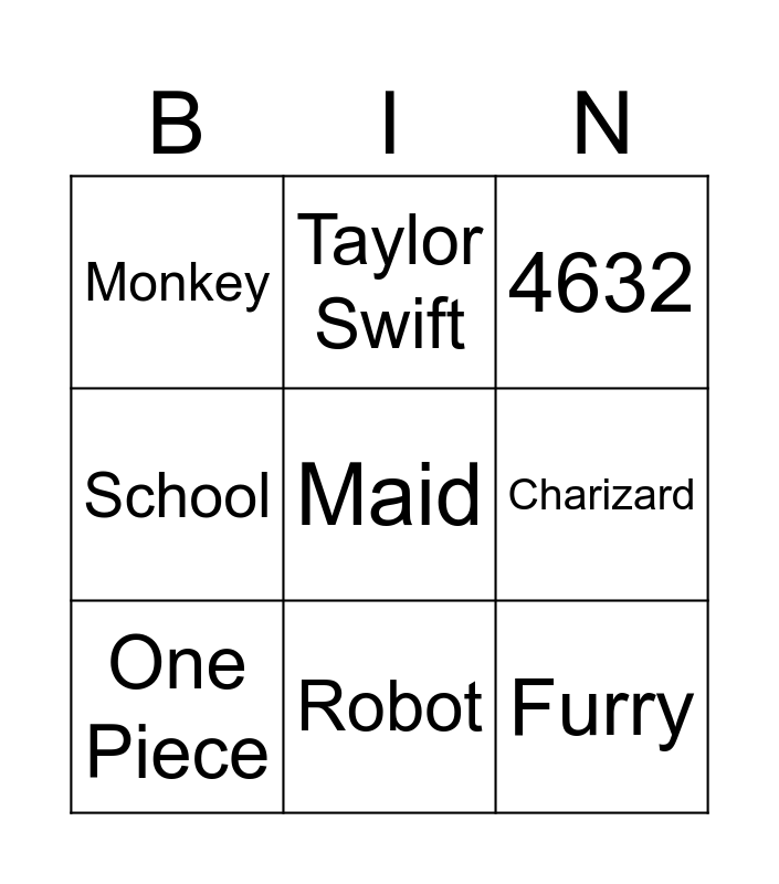 This bingo card has 9 words: One Piece, Maid, 4632, Monkey, Taylor Swift, Charizard, School, Robot and Furry.
