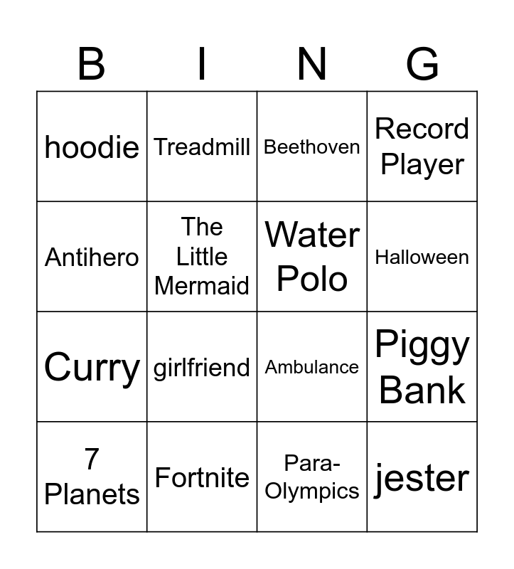 This bingo card has 95 words: Spinach, Walle, Ronald McDonald, PS4, Spider, Vacuum, glitter, Manhattan, Checkers, Uno, Sapphire, Skeleton, Poison ivy, Halloween, cog, hoodie, girlfriend, grandma, barbershop, ornament, Crash Bandicoot, tinnitus, tongue, Spaghetti and Meatballs, Record Player, The Little Mermaid, Stained Glass, Curry, Mini Golf, Tangerine, Pimple, Wheel, Starbucks, Weed Brownie, Calzone, Sumo Wrestler, Leaning Tower of Pisa, Garfield, Ambulance, Chernobyl, slinky, Piggy Bank, Memory, Antihero, Library Card, Fortnite, League of Legends, Fruit Punch, Beer Pong, Couch, Sea Cucumber, Board Game(s), Cylinder, Dorito(s), Lawsuit, Tap Dancing, Underwear, Cappuccino, Green Tea, Penne, Water Polo, ASMR, Blizzard, The Grinch, The 5 Senses, 10 Zoo animals, 5 Zodiac Signs, Optimus Prime, Beethoven, Sharp Cheddar, Beef Jerky, Angler Fish, 7 Planets, Golden Gate Bridge, Escape, Bubble Gum, Kirby, Thumb, Chainsaw, Treadmill, Tricycle, The 5 Emotions From Inside Out, Albatross, Bowling, Para-Olympics, jester, Fertilizer, Birthday Cake, 3 Jollyrancher Flavors, Grubhub, Honeymoon, Plankton, pumpkin pie, Poppy and 3 Ingredients for a PBJ.