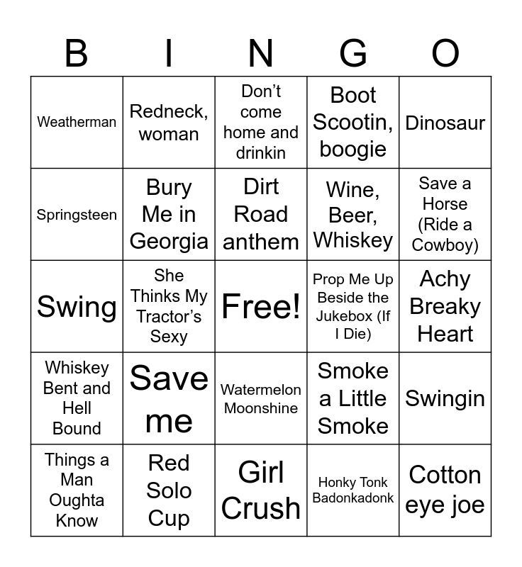 This bingo card has a free space and 39 words: Speechless, H.o.l.y, Heaven, Bury Me in Georgia, Things a Man Oughta Know, Watermelon Moonshine, Dirt Road anthem, Big green tractor, Dinosaur, Whiskey Bent and Hell Bound, She Thinks My Tractor’s Sexy, Boot Scootin, boogie, Cotton eye joe, Achy Breaky Heart, Prop Me Up Beside the Jukebox (If I Die), Save me, Buy Me a Boat, Weatherman, I’m gonna miss her, Smoke a Little Smoke, Springsteen, Girl Crush, Wine, Beer, Whiskey, Save a Horse (Ride a Cowboy), Country Girl (Shake It For Me), Tennessee Whiskey, Rambling Man, Starting over, Sin Wagon, Redneck, woman, Jolene, Devil went down to Georgia, Don’t come home and drinkin, Red Solo Cup, Honky Tonk Badonkadonk, Step That Step, Swingin, Swing and Speechless.
