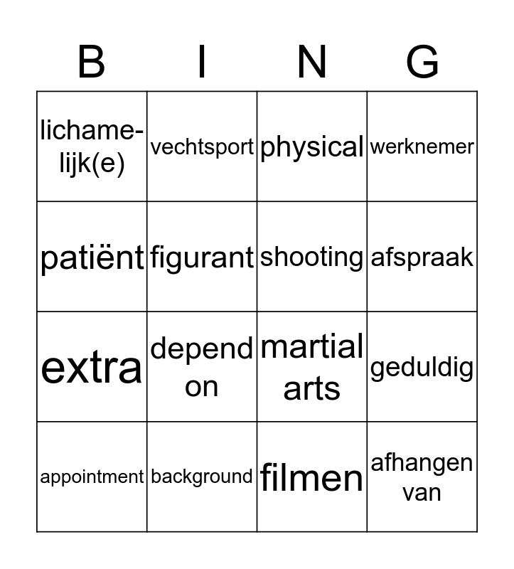 This bingo card has 16 words: background, geduldig, physical, lichame- lijk(e), extra, vechtsport, martial arts, filmen, patiënt, figurant, appointment, werknemer, depend on, afspraak, shooting and afhangen van.