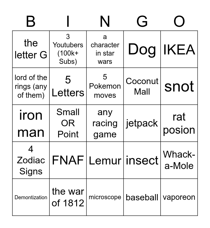 This bingo card has a free space and 24 words: FNAF, the war of 1812, 5 Pokemon moves, Demontization, IKEA, the letter G, lord of the rings (any of them), 3 Youtubers (100k+ Subs), jetpack, Lemur, Coconut Mall, iron man, insect, Whack-a-Mole, 5 Letters, baseball, rat posion, a character in star wars, snot, Small OR Point, vaporeon, 4 Zodiac Signs, Dog and microscope.