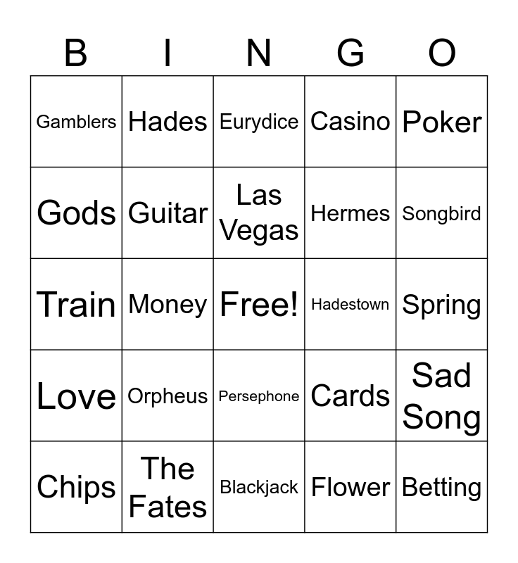 This bingo card has a free space and 24 words: Orpheus, The Fates, Las Vegas, Chips, Poker, Gamblers, Gods, Hades, Hadestown, Persephone, Hermes, Train, Cards, Sad Song, Guitar, Flower, Spring, Eurydice, Songbird, Money, Betting, Love, Casino and Blackjack.