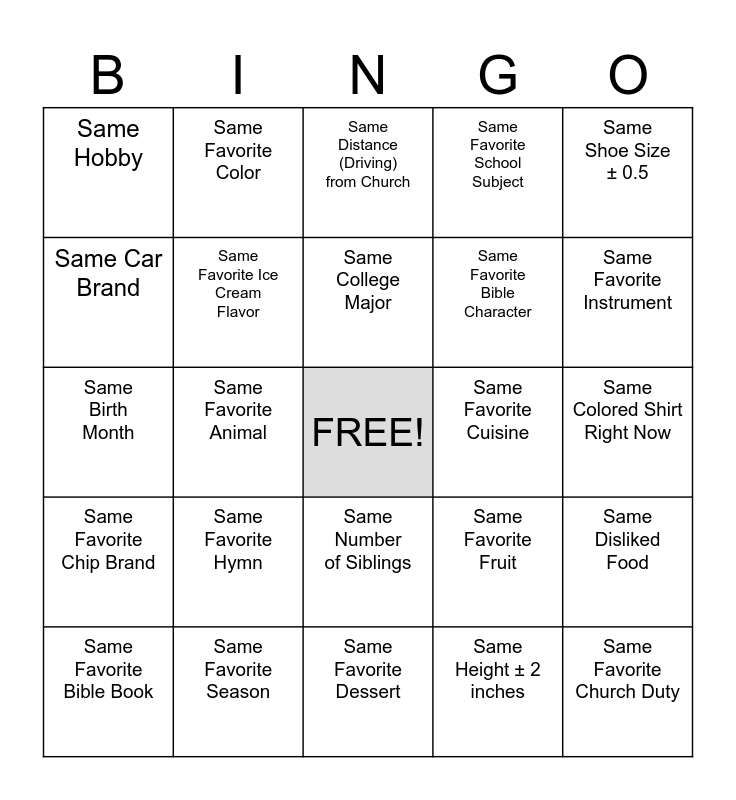 This bingo card has a free space and 24 words: Same Favorite Hymn, Same Favorite Season, Same College Major, Same Favorite Bible Book, Same Shoe Size ± 0.5, Same Hobby, Same Car Brand, Same Favorite Color, Same Favorite Cuisine, Same Number of Siblings, Same Favorite Bible Character, Same Birth Month, Same Favorite Fruit, Same Disliked Food, Same Favorite Ice Cream Flavor, Same Height ± 2 inches, Same Colored Shirt Right Now, Same Distance (Driving) from Church, Same Favorite Instrument, Same Favorite Animal, Same Favorite Church Duty, Same Favorite Chip Brand, Same Favorite School Subject and Same Favorite Dessert.