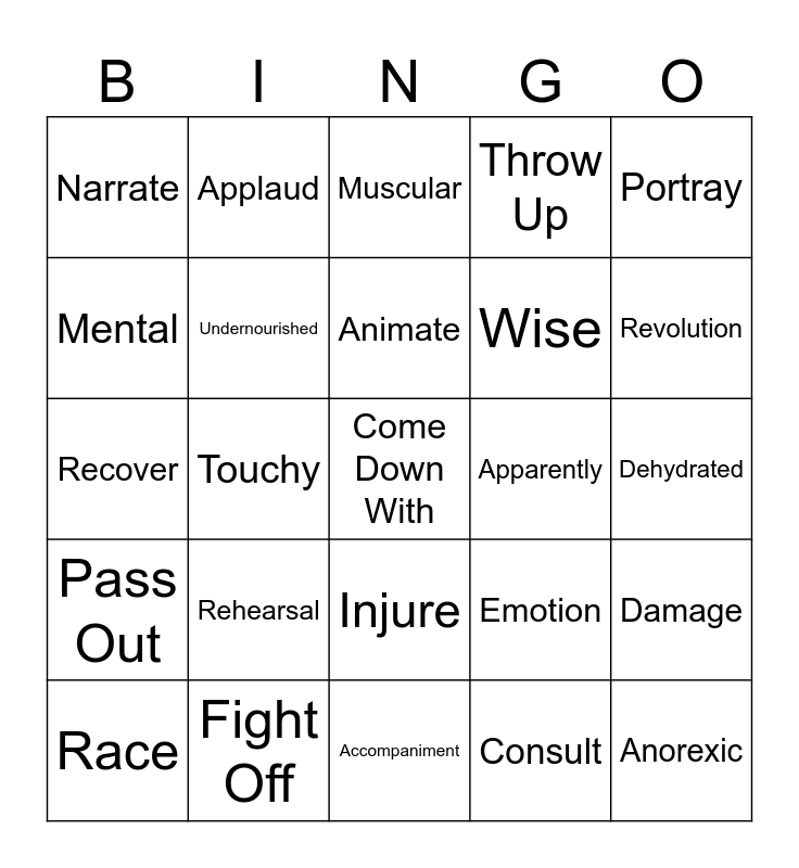 This bingo card has 25 words: Rehearsal, Accompaniment, Animate, Race, Portray, Narrate, Mental, Applaud, Apparently, Injure, Wise, Recover, Emotion, Damage, Undernourished, Anorexic, Dehydrated, Muscular, Revolution, Touchy, Come Down With, Fight Off, Pass Out, Throw Up and Consult.