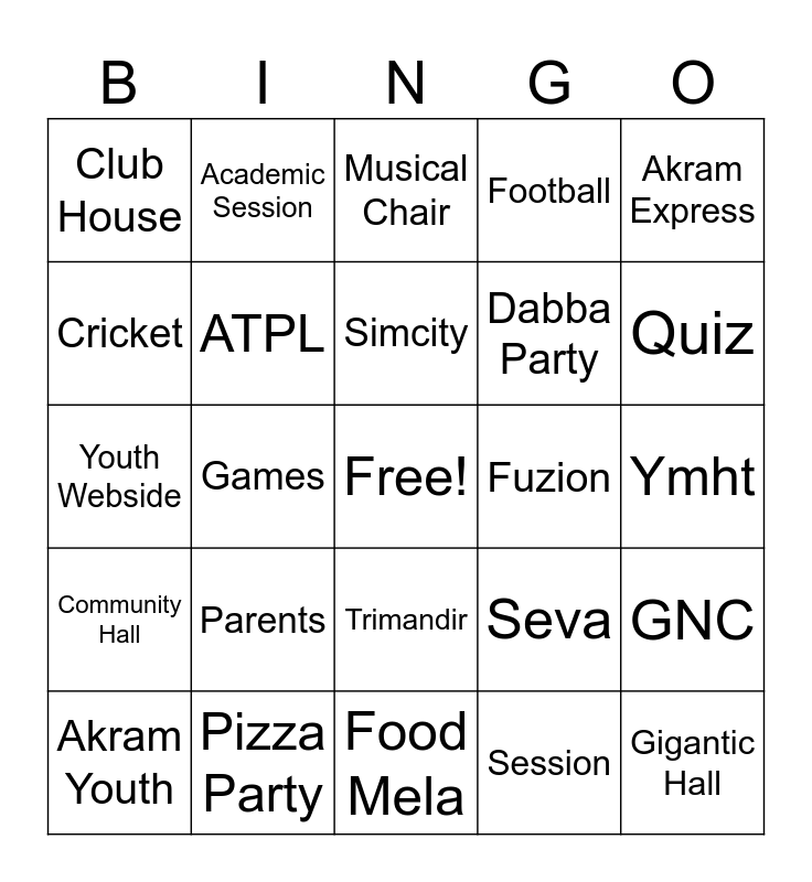 This bingo card has a free space and 28 words: GNC, Picnic, Dabba Party, Session, Cricket, Musical Chair, Academic Session, Community Hall, Fuzion, Akram Youth, Youth Webside, Football, Pizza Party, Food Mela, Quiz, School, Parents, ATPL, Simcity, Trimandir, Club House, DNCC, Gigantic Hall, Games, Ymht, Seva, Akram Express and Happiness.