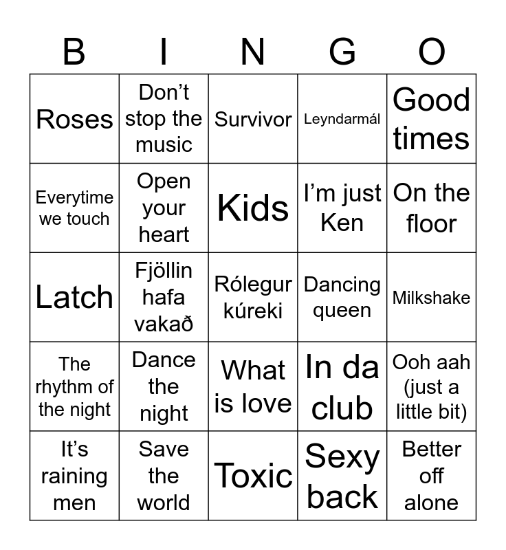 This bingo card has 30 words: Save the world, We found love, Fjöllin hafa vakað, Creep, Roses, Survivor, Open your heart, What is love, Dancing queen, Toxic, Milkshake, Rólegur kúreki, Sexy back, Better off alone, On the floor, Poker face, In da club, The rhythm of the night, Dance the night, Good times, Latch, Another one bites the dust, Don’t stop the music, I’m just Ken, Everytime we touch, Leyndarmál, Ooh aah (just a little bit), It’s raining men, Kids and Kung fu fighting.