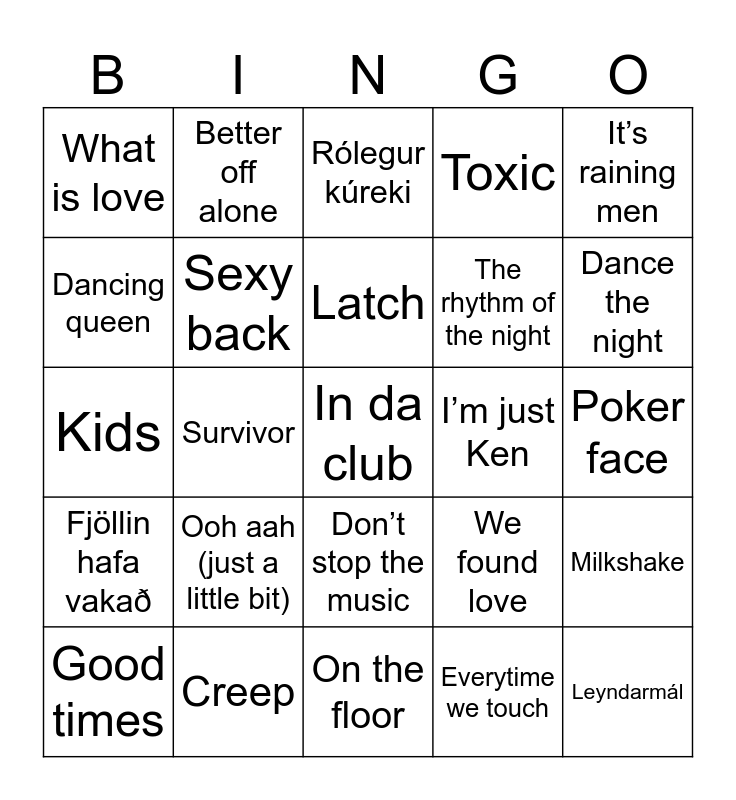 This bingo card has 30 words: Creep, Roses, Survivor, Open your heart, What is love, Rólegur kúreki, Sexy back, Don’t stop the music, I’m just Ken, On the floor, Poker face, In da club, Everytime we touch, Leyndarmál, Dance the night, Save the world, We found love, Fjöllin hafa vakað, Ooh aah (just a little bit), It’s raining men, Kids, Kung fu fighting, Better off alone, The rhythm of the night, Dancing queen, Toxic, Milkshake, Good times, Latch and Another one bites the dust.