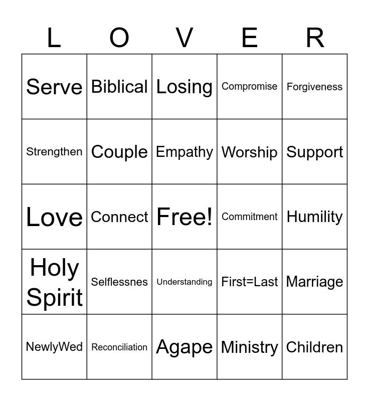 This bingo card has a free space and 43 words: Winning, Children, Empowered, NewlyWed, Empty Nesters, Ministry, Losing, Mutual Submission, Forgiveness, Reconciliation, Compromise, Commitment, Understanding, Selflessnes, Sacrifice, Agape, God, Love, Submission, Support, Biblical, Prioritize, Private, Serve, CommonGoals, Humility, Learning, Least, First=Last, Holy Spirit, Victory, Marriage, Vows, Connect, 3-prong, Cooperation, Share, Empathy, Strengthen, Worship, Unit, Couple and Unbreakable.