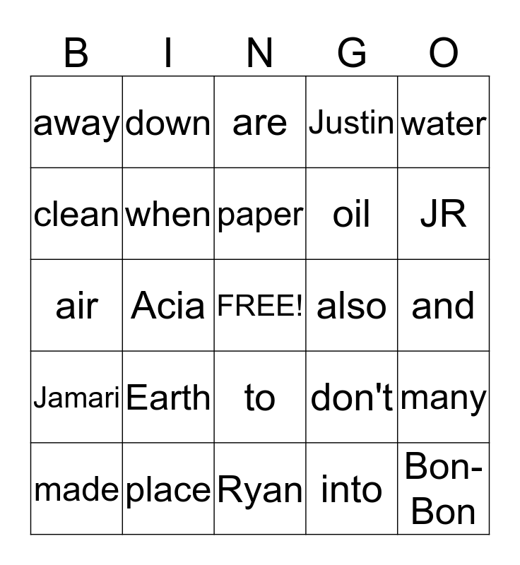 This bingo card has a free space and 24 words: Earth, place, paper, made, water, away, clean, down, also, to, oil, air, don't, many, when, into, and, are, JR, Acia, Bon-Bon, Jamari, Justin and Ryan.