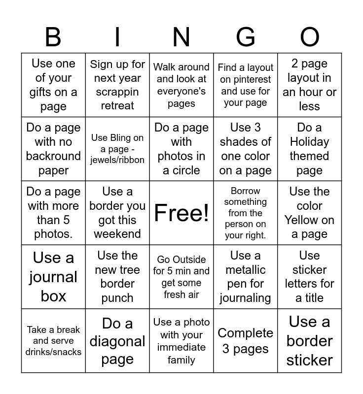 This bingo card has a free space and 24 words: Take a break and serve drinks/snacks, Use the new tree border punch, Do a page with photos in a circle, Complete 3 pages, 2 page layout in an hour or less, Use one of your gifts on a page, Sign up for next year scrappin retreat, Walk around and look at everyone's pages, Borrow something from the person on your right., Use the color Yellow on a page, Do a page with more than 5 photos., Use Bling on a page - jewels/ribbon, Use a metallic pen for journaling, Use sticker letters for a title, Do a page with no backround paper, Do a diagonal page, Use a photo with your immediate family, Find a layout on pinterest and use for your page, Do a Holiday themed page, Use a journal box, Use a border you got this weekend, Go Outside for 5 min and get some fresh air, Use 3 shades of one color on a page and Use a border sticker.