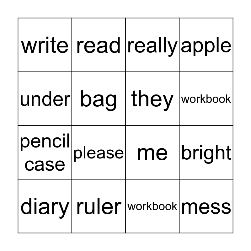 This bingo card has 30 words: school, think, bright, can, write, really, they, pen, ruler, rubber, workbook, diary, many, How many?, please, Thank you, room, mess, where, under, me, art, read, pencil case, bag, apple, lesson, How many?, workbook and school.