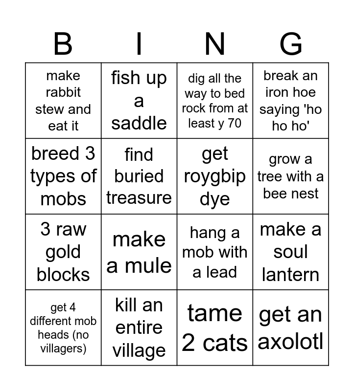 This bingo card has 16 words: kill an entire village, make a soul lantern, dig all the way to bed rock from at least y 70, make rabbit stew and eat it, 3 raw gold blocks, fish up a saddle, hang a mob with a lead, tame 2 cats, breed 3 types of mobs, find buried treasure, get 4 different mob heads (no villagers), break an iron hoe saying 'ho ho ho', make a mule, grow a tree with a bee nest, get roygbip dye and get an axolotl.