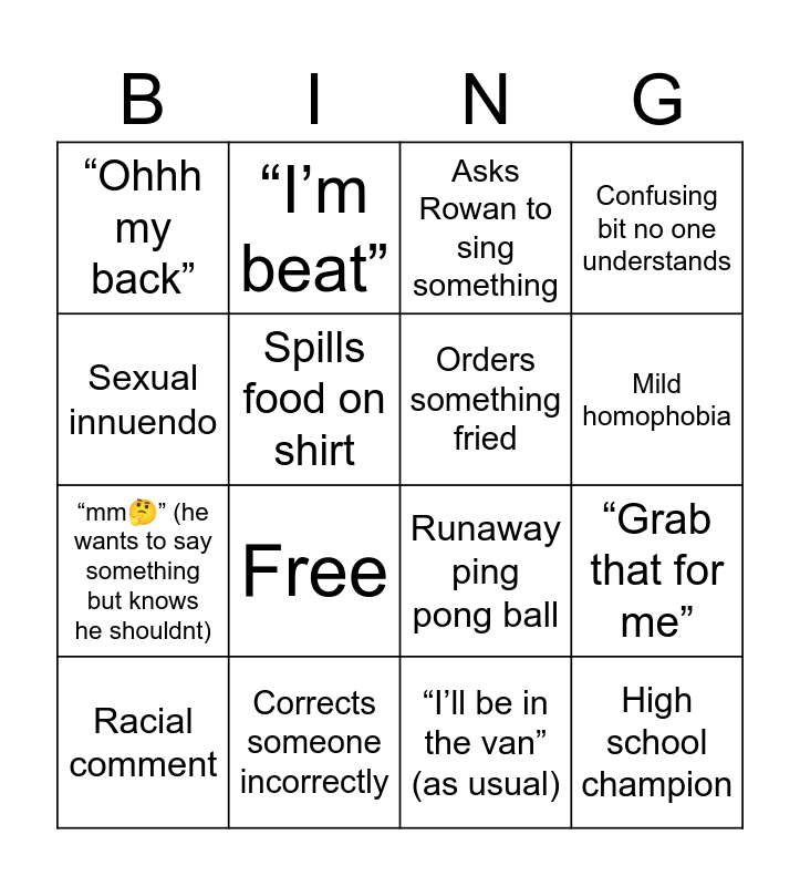 This bingo card has 16 words: Corrects someone incorrectly, “Grab that for me”, Asks Rowan to sing something, “Ohhh my back”, “mm🤔” (he wants to say something but knows he shouldnt), “I’m beat”, Runaway ping pong ball, “I’ll be in the van” (as usual), Sexual innuendo, Spills food on shirt, Racial comment, Confusing bit no one understands, Free, Mild homophobia, Orders something fried and High school champion.