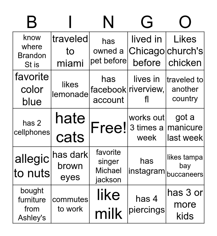 This bingo card has a free space and 24 words: has dark brown eyes, commutes to work, has facebook account, bought furniture from Ashley's, Likes church's chicken, know where Brandon St is, favorite color blue, traveled to miami, works out 3 times a week, favorite singer Michael jackson, lives in riverview, fl, has 2 cellphones, has instagram, likes tampa bay buccaneers, likes lemonade, has 4 piercings, got a manicure last week, has owned a pet before, traveled to another country, hate cats, has 3 or more kids, allegic to nuts, lived in Chicago before and like milk.
